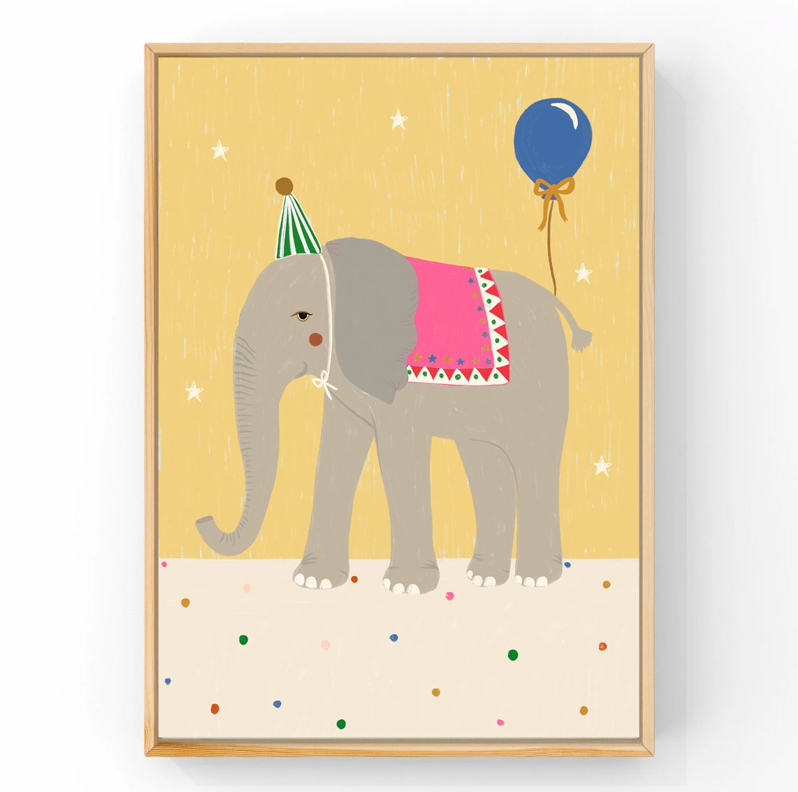 Featuring a sweet grey elephant wearing a festive party hat in a print captures the joy and imagination of childhood. A balloon floats nearby, and colourful confetti dots add a sprinkle of fun to the scene. Perfect for animal lovers and little dreamers. This print will add colour, character, and a touch of magic to any space.
