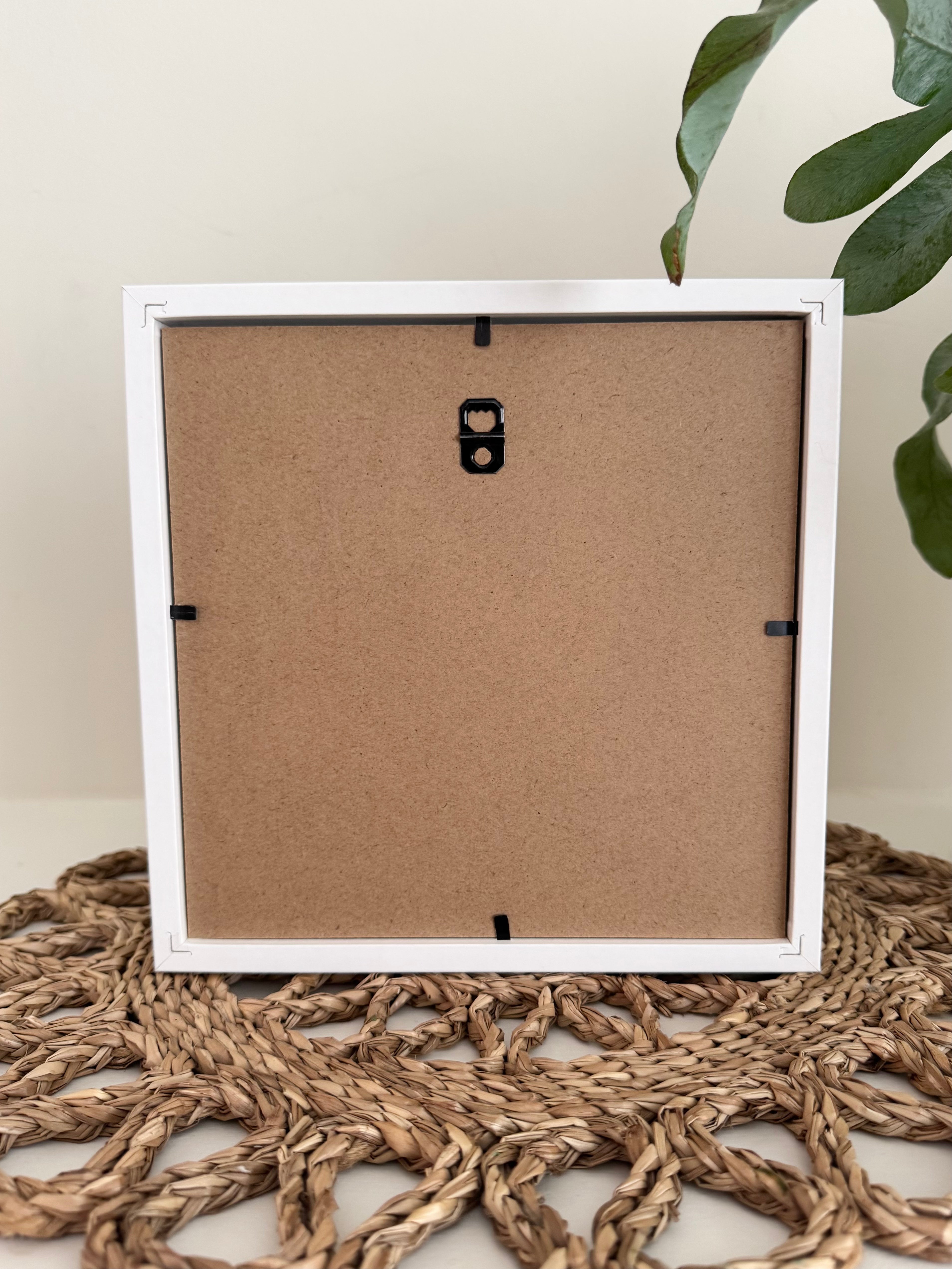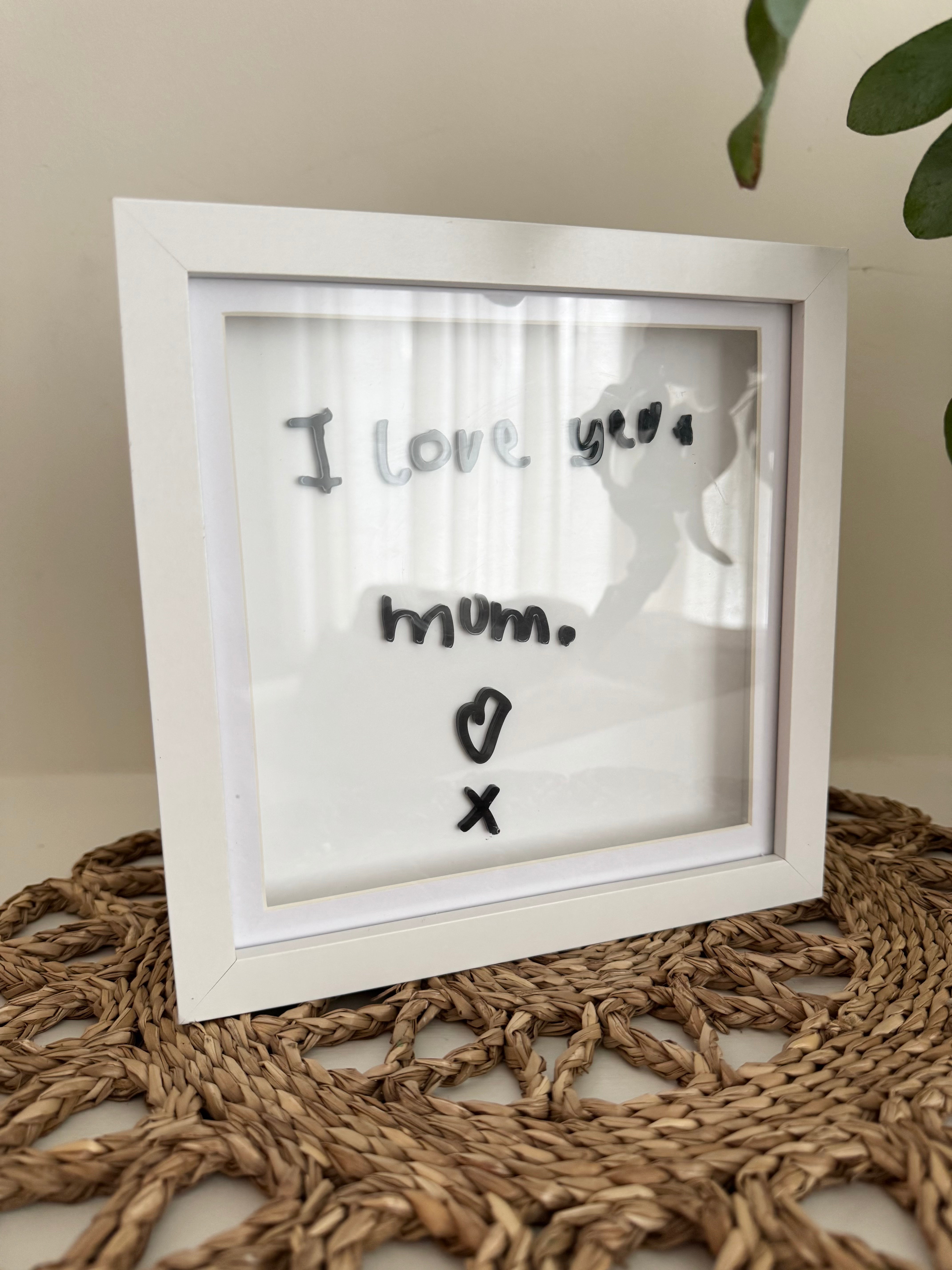 This 18cm x 18cm white box frame features a love message for Mum, finished in raised black acrylic lettering for a clean, modern look that suits any home.