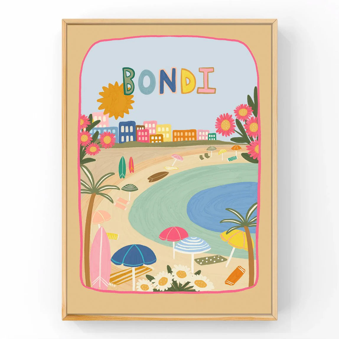 Warm sandy tones are balanced with ocean blues and pops of pink, yellow and coral, creating a cheerful yet calm palette that feels fresh and timeless. The bold “Bondi” lettering adds a fun, location-inspired touch while keeping the design clean and easy to style.
