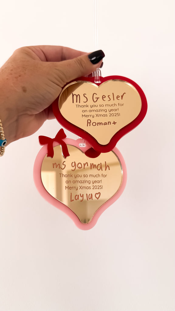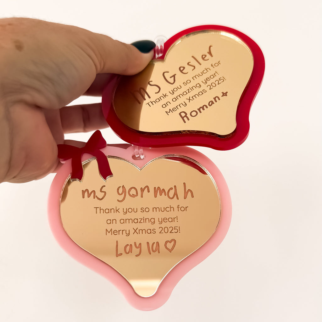 These luxe heart shaped acrylic baubles are the perfect personalised gift for teachers, carers, friends or loved ones. Crafted in premium mirrored acrylic and layered with your choice of border colour, each bauble is engraved with your custom message “Thank you,” “Merry Christmas,” or anything you like!