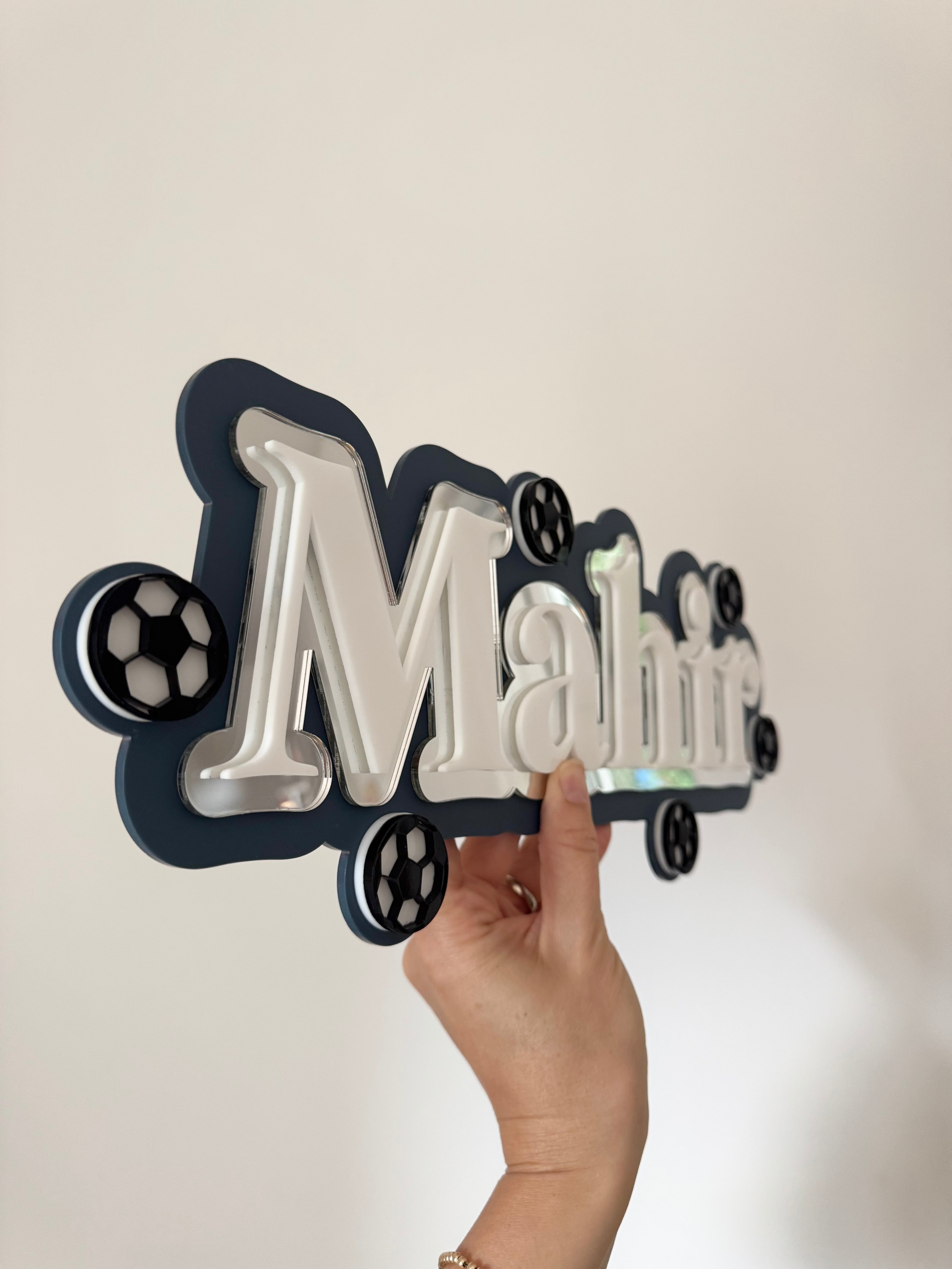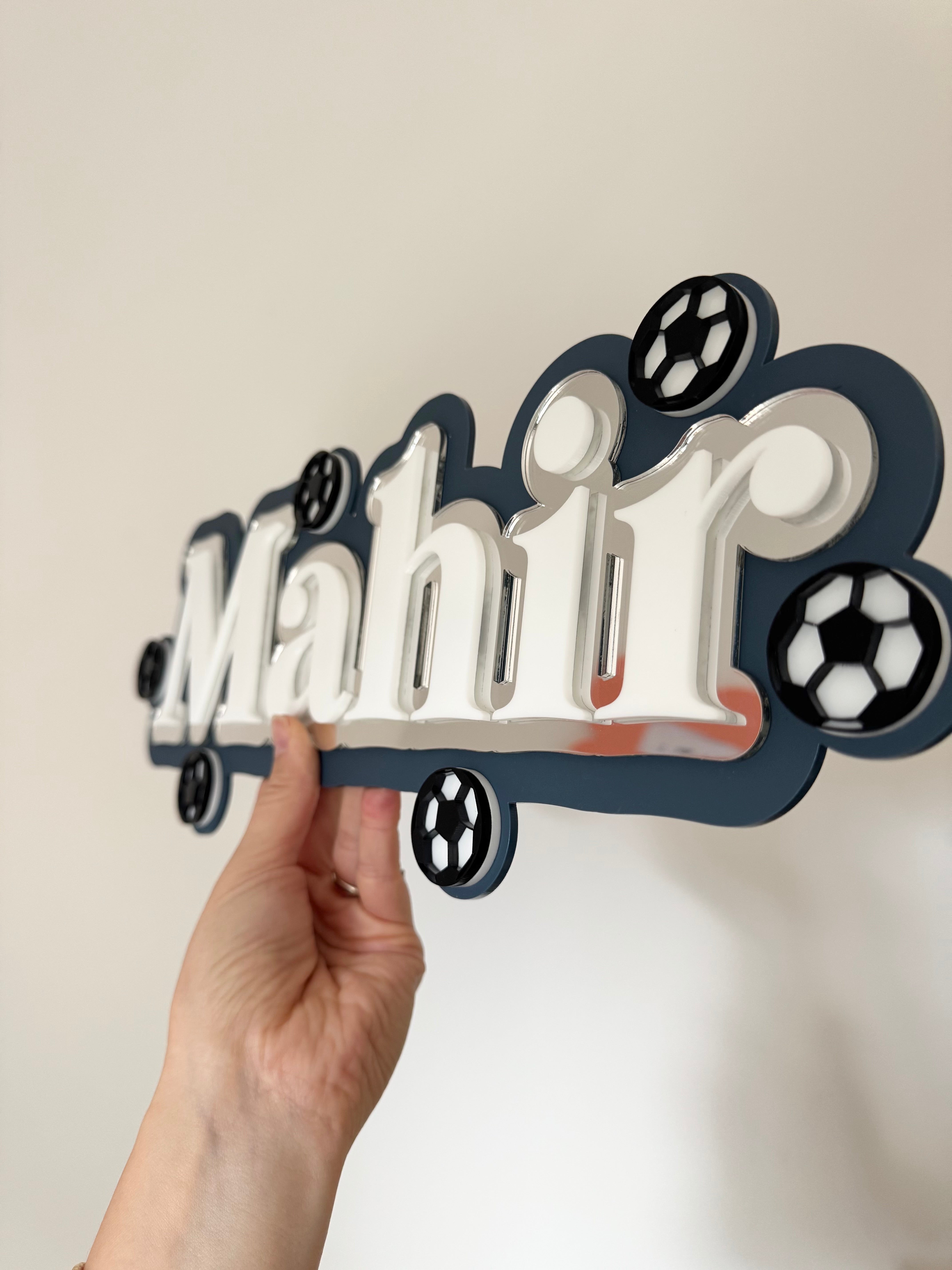 Personalised football themed name sign with mini football details. Perfect for sports lovers' bedrooms, it adds a fun touch to walls and shelves, and is available in a range of colours to suit any decor or to match their favourite team colours!
