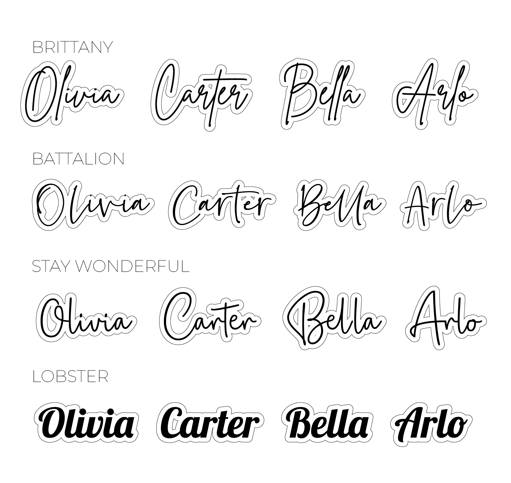 *Brittany font is a higher font and therefore often reaches the hight cap before the length. This font is best for longer names.